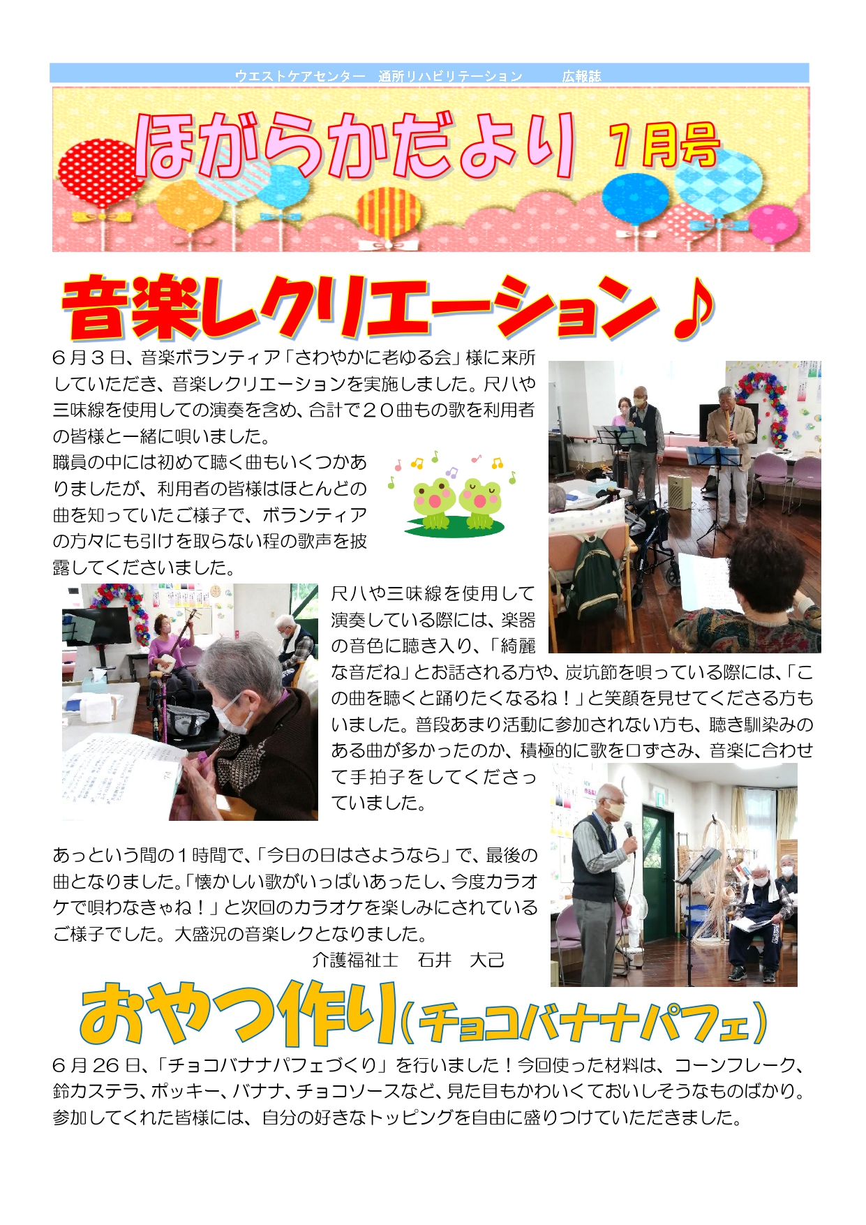 通所リハビリでのイベントや訓練等の報告を行っている広報誌「ほがらかだより」7月号が発行されました。